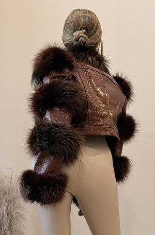 Della Fur Trim Crop Leather Jacket in Brown