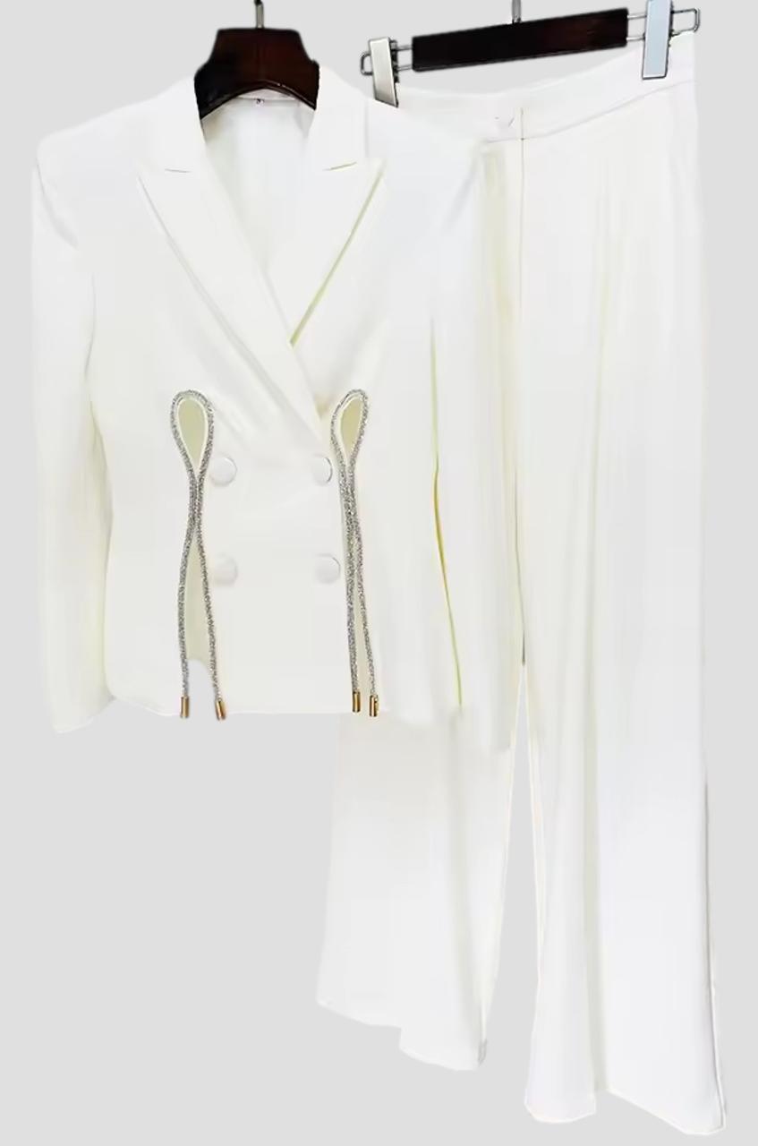 Adriana Yellow Double Breasted Pantsuit features a luxury double breasted blazer with rhinestone double slit details in front, lightly padded shoulders, and long sleeves with buttoned cuffs that completes a high waisted pants with pleated details and side pockets.