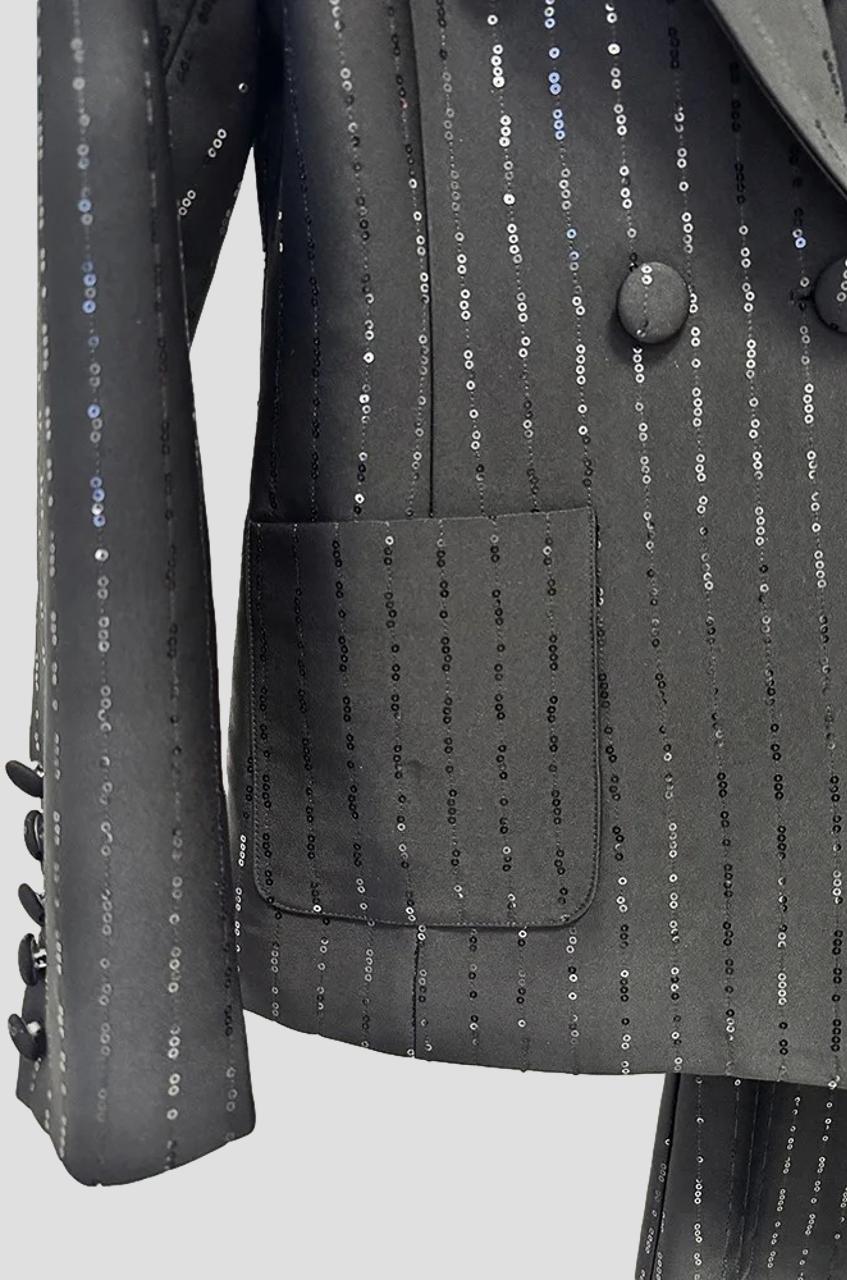 - Double-breasted tailored blazer with sequin pinstripe detailing