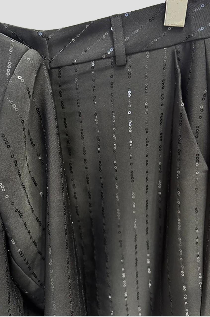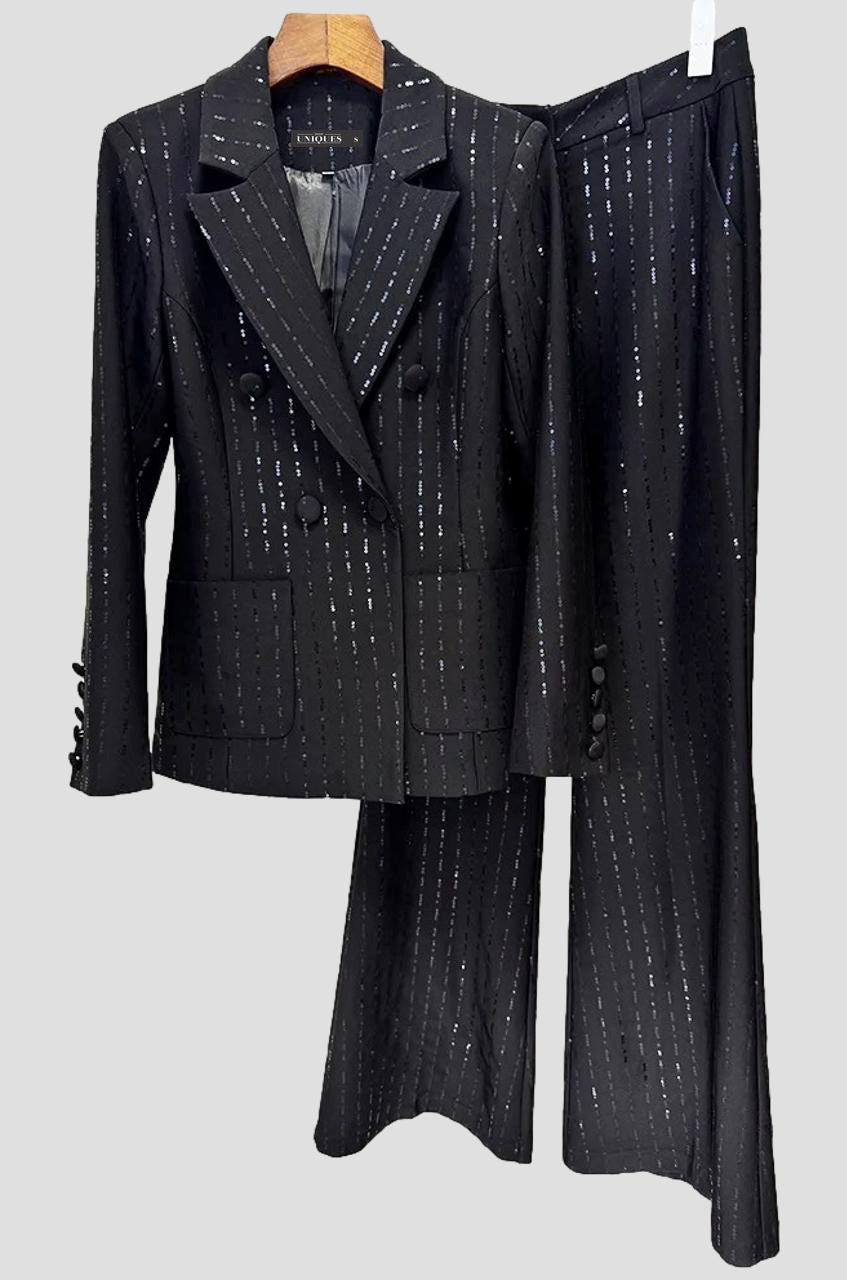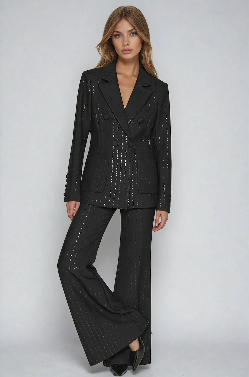 The Noir Sequin Pinstripe Blazer Pantsuit is a modern power embellished suit designed for evenings, events, and elevated occasions. Featuring a tailored double-breasted blazer and matching straight-leg pants, this black pantsuit is detailed with subtle vertical sequin pinstripes that add refined shine without overpowering the silhouette. Polished, structured, and statement-making, it’s the perfect choice for women seeking a dressy pantsuit that feels bold yet sophisticated.