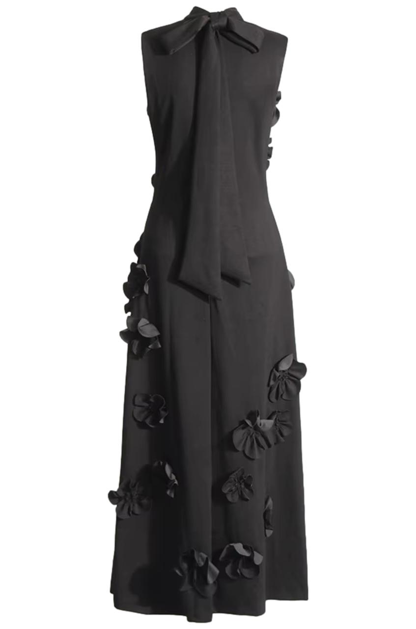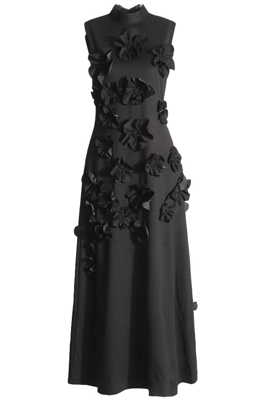 Giana Embroidered Floral Applique Maxi Dress features a sleeveless maxi dress with mock neckline, hidden back zip closure with rear bow fastening, and slip pockets to the sides.