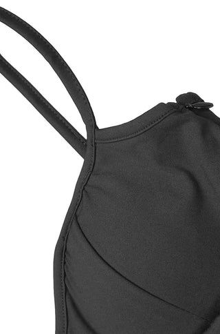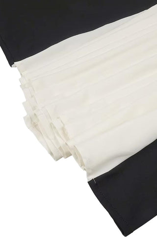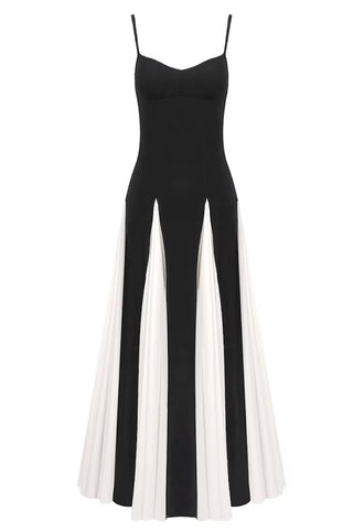 Pamela Black & White Paneled A-Line Maxi Dress features an a-line maxi skirt with white paneled, lightly padded bust with spaghetti straps, and hidden side zip closure.