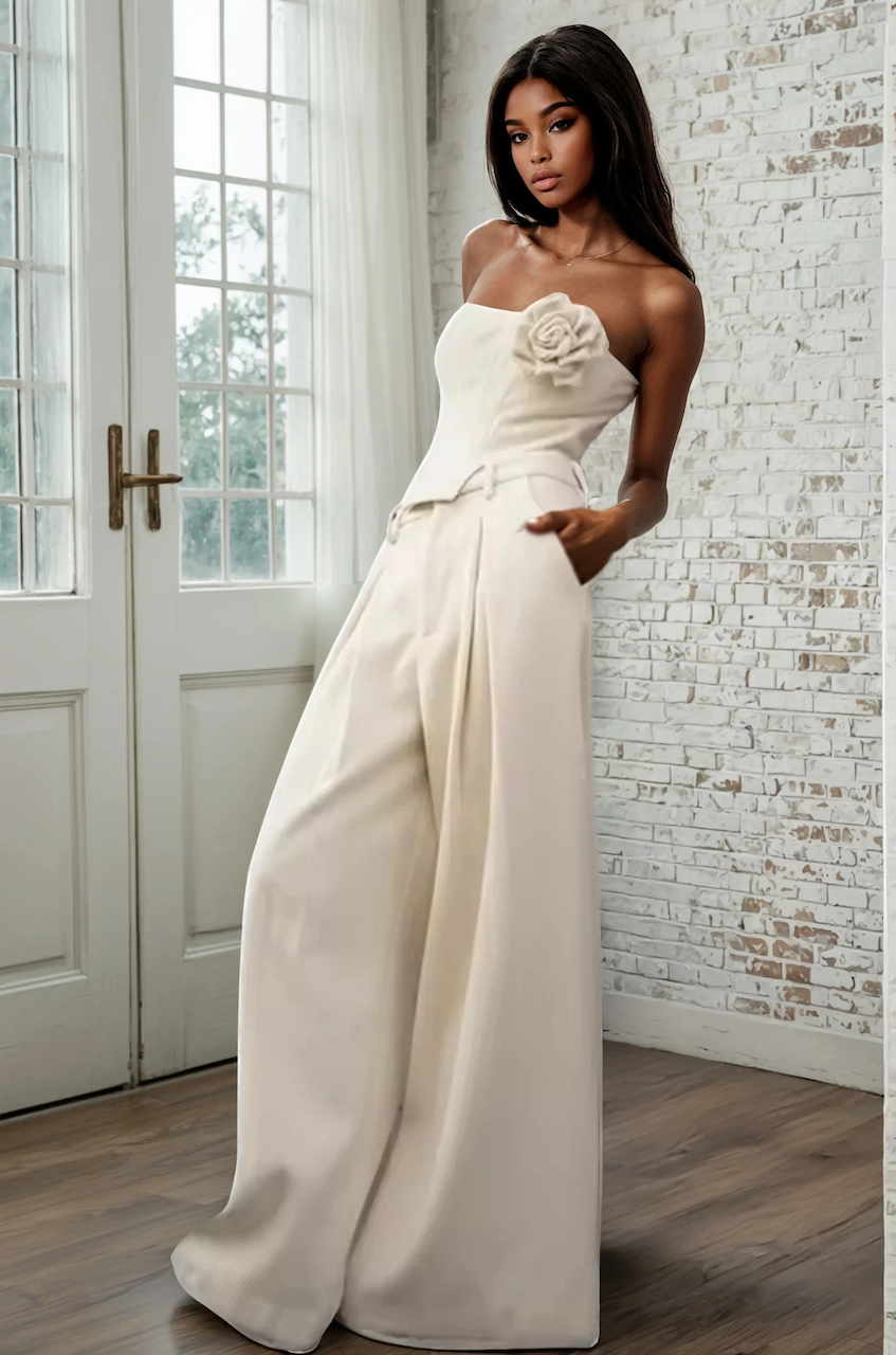Genesis Corset & Wide Leg Pants Set features a bonned cropped corset with 3D flower in front and exposed zipper in back that completes a high waisted wide leg pants.