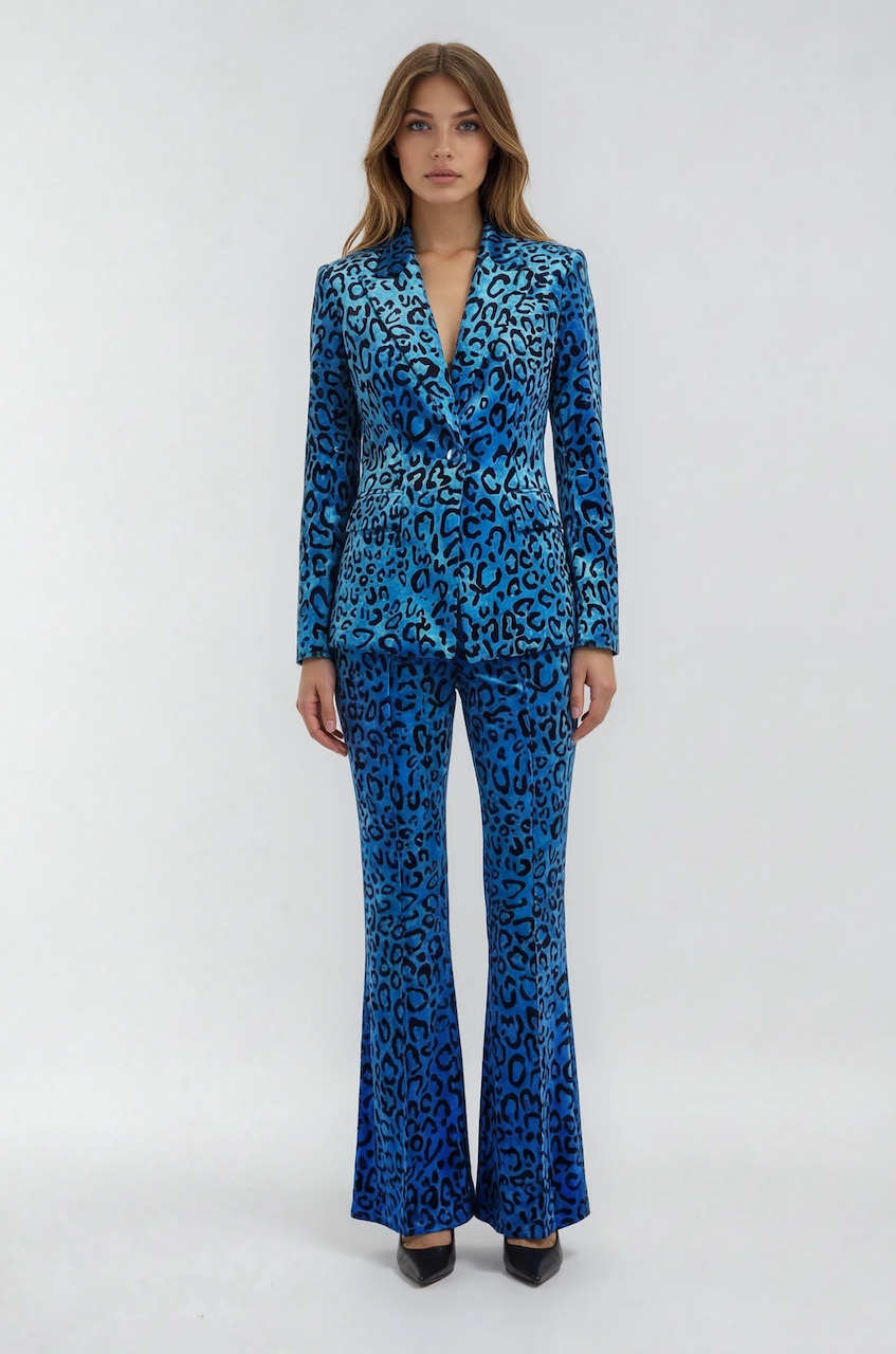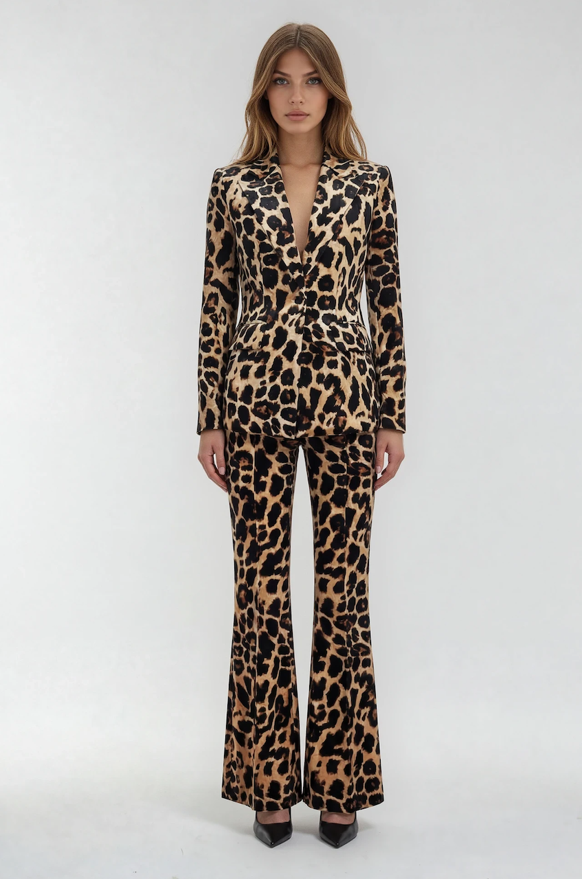 Make a bold entrance in the Adele Velvet Leopard Blazer Pants Set, a statement designer-inspired pantsuit crafted for women who want power dressing with attitude. This luxury matching set features a tailored velvet blazer paired with sleek, elongating trousers in a rich leopard print that feels elevated, not loud.