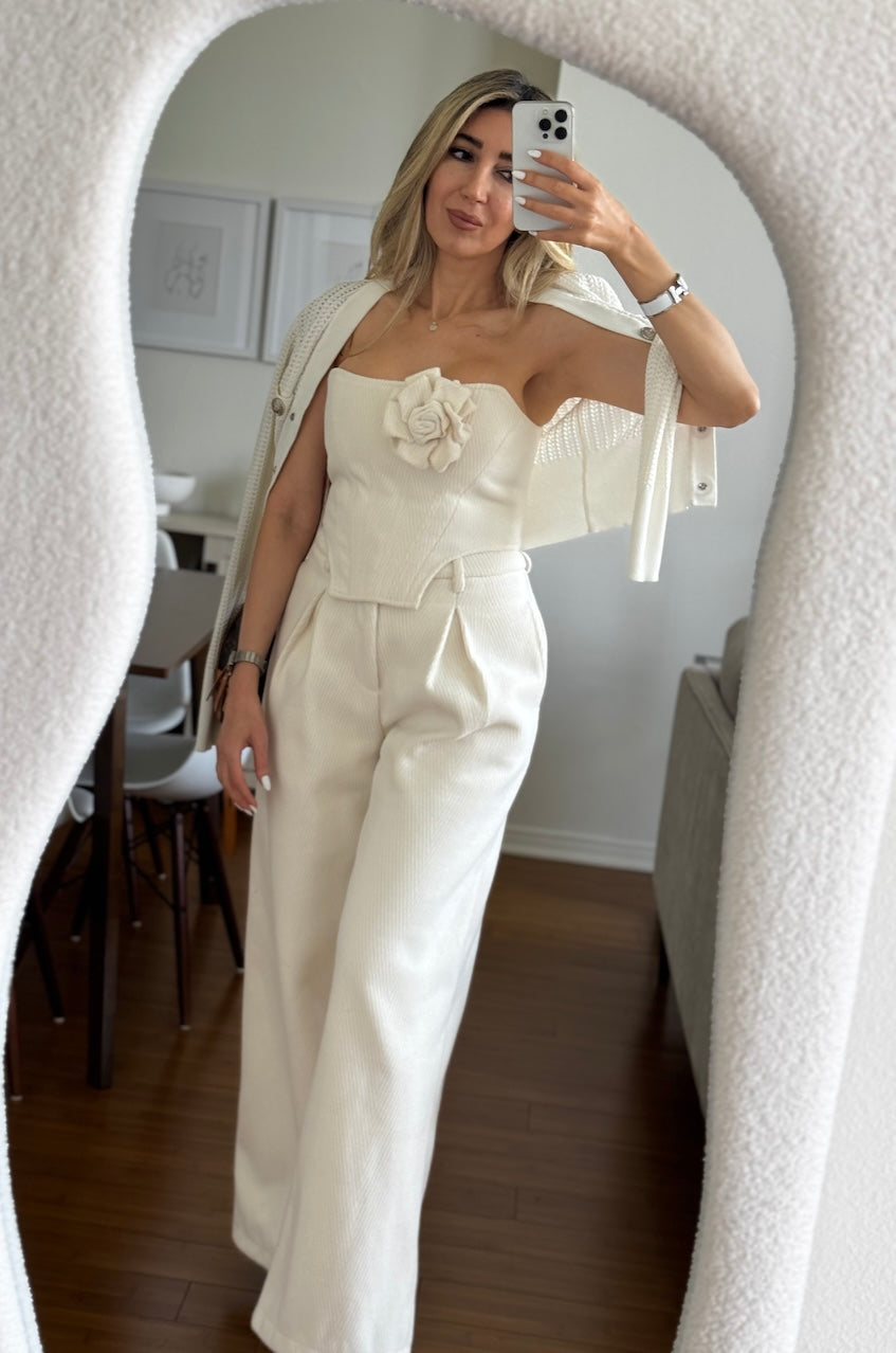 Genesis Corset & Wide Leg Pants Set features a bonned cropped corset with 3D flower in front and exposed zipper in back that completes a high waisted wide leg pants.