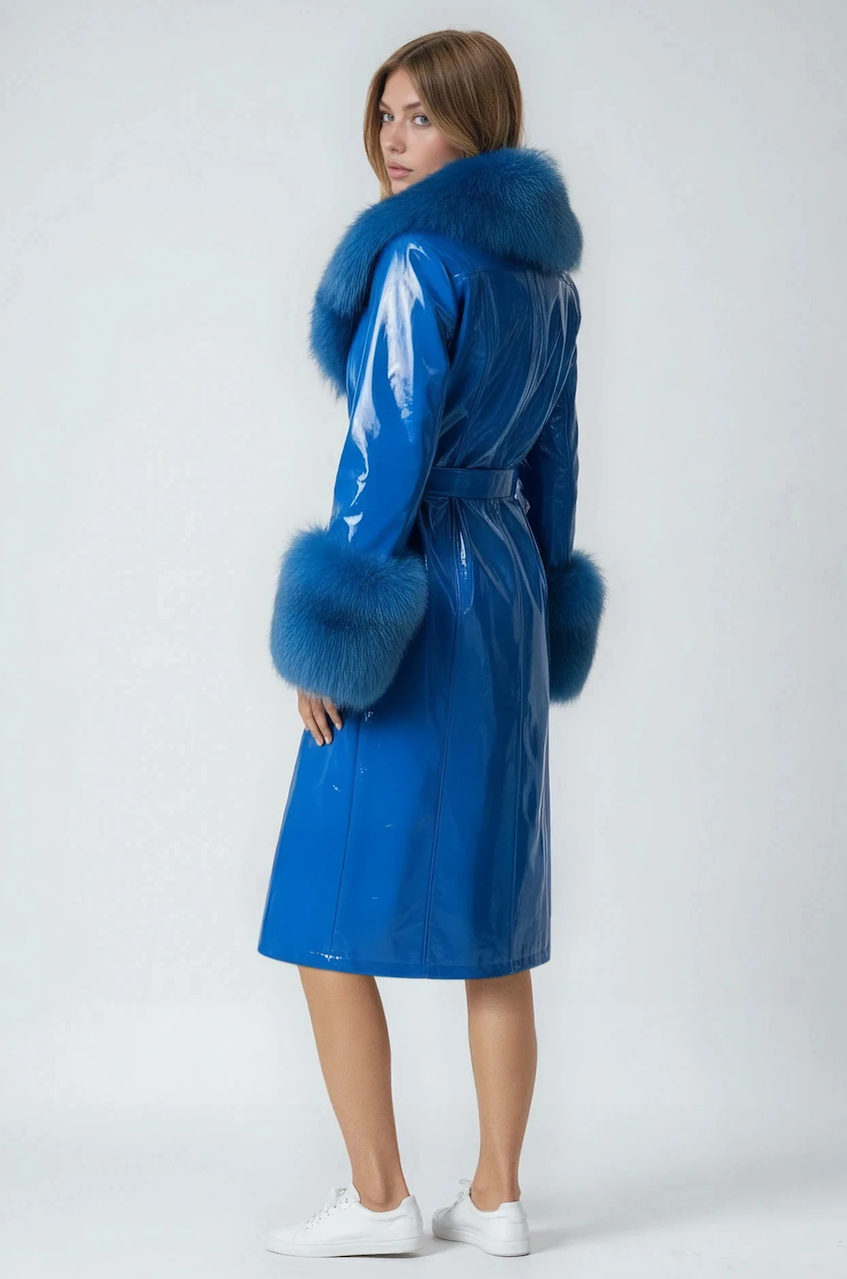 Look stylishly cozy in our Faux Fur Collar Genuine Patent Leather Trench Coat featuring a fur trimmed collar, long sleeves with fur cuffs, belted waist with belt loops, front button closer, A-line silhouette, side welt pockets, and mid length hem.
