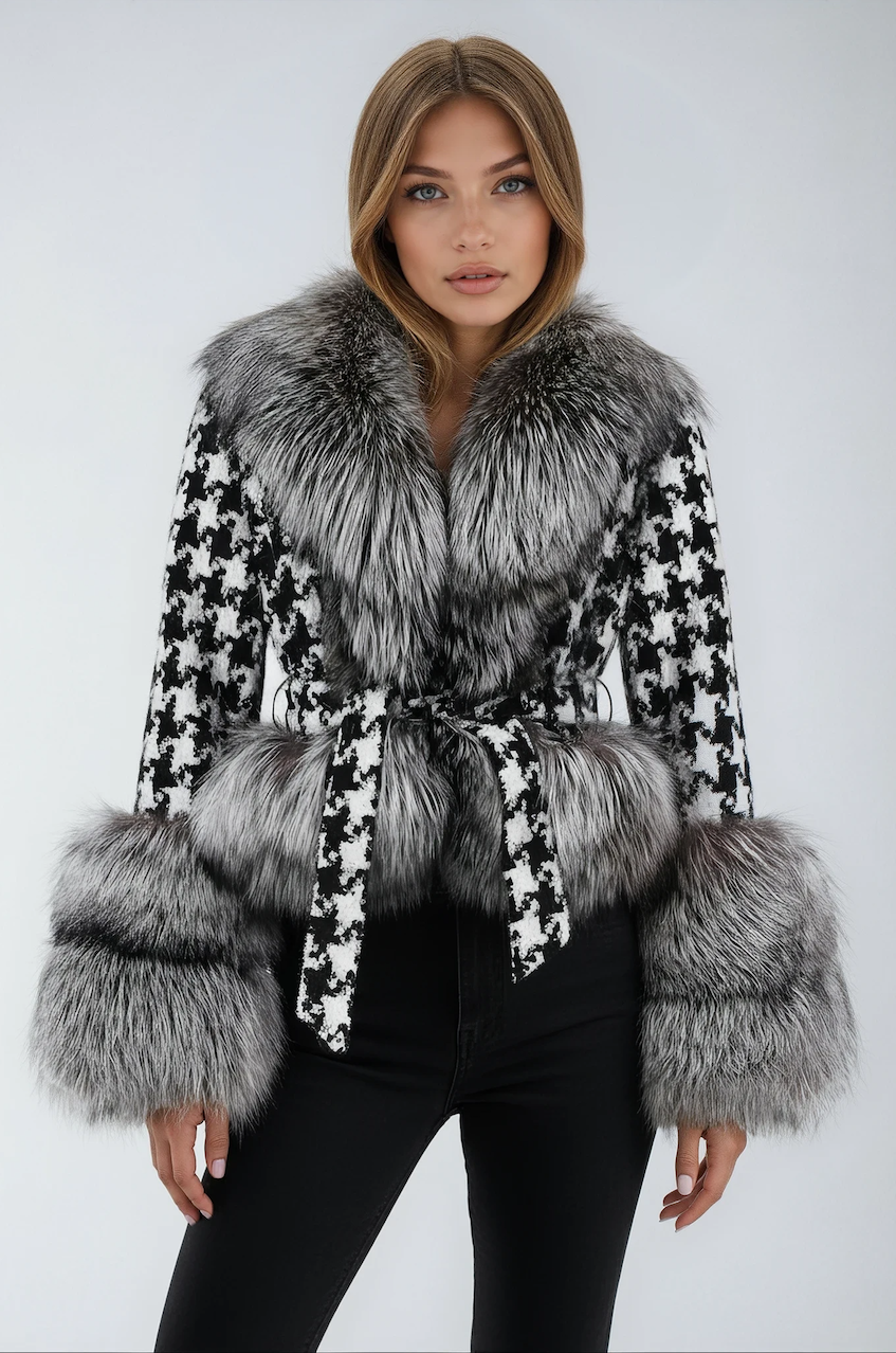 Sheri Fox Fur Tweed Belted Jacket featuring houndstooth tweed fabric, fox fur lined cuffs, and a self-tied belt is a timeless piece for Winter.